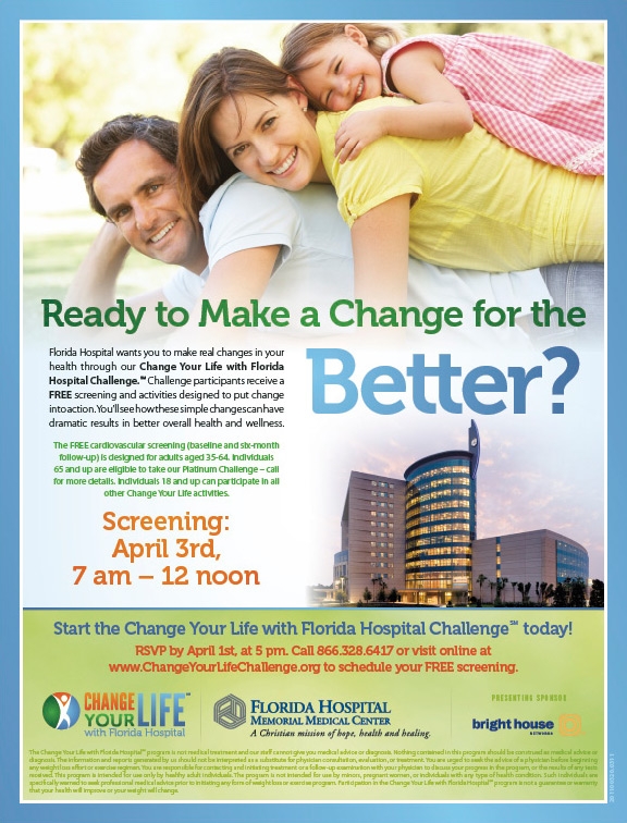 We invite you, your spouses, friends and co-workers to sign-up for the Change Your Life with Florida Hospital Challenge℠. This FREE program is designed to improve the health, nutrition and outlook of each participant aged 35-64 through weekly activities! Join us Sunday, April 3 at Florida Hospital Memorial Medical Center, for a FREE cardiovascular baseline screening. Please feel free to pass this email to anyone who you think may be interested. I’ve also attached a flier that you can hang up wherever you’d like. Thank you for your continued work and partnership with Florida Hospital.